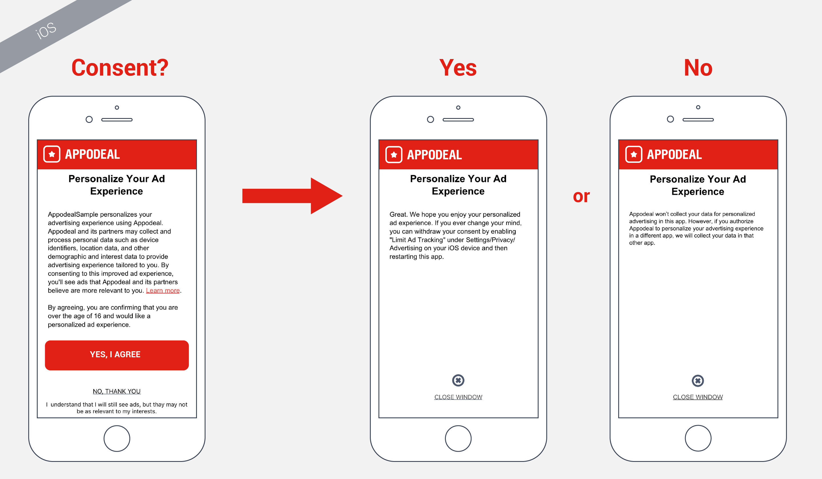 In case an end-user doesn’t agree on processing their personal data, Appodeal SDK will notify all ad demand partners so they won’t collect any information from this user and our ad demand partners will just show non-targeted and less relevant ads to such users. If consent is given, they will personalize an end-user ad experience in accordance with shared information.