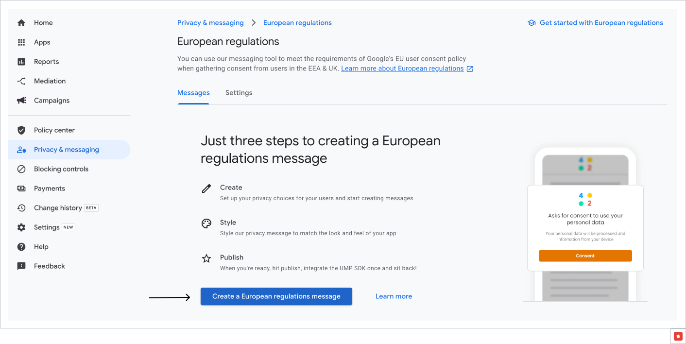 Create A European Regulations Message in Admob