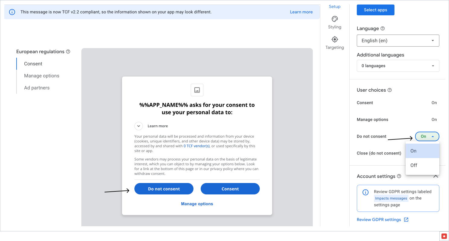 - In the User choices section, make a decision for the Do not consent option. If it is enabled, then this message provides your users with a choice to not consent to your ad partners and your ad partners’ purposes with a single click on the first page of the message.