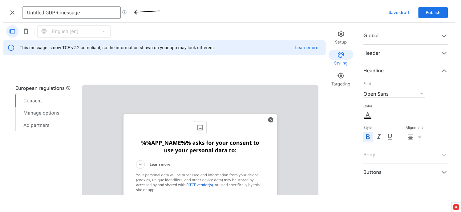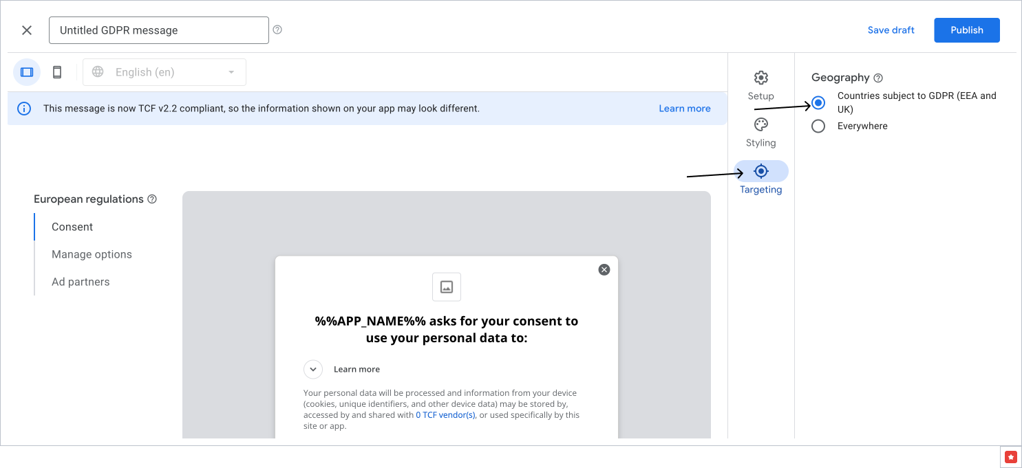 - In the Targeting section, select Countries subject to GDPR (EEA and UK).