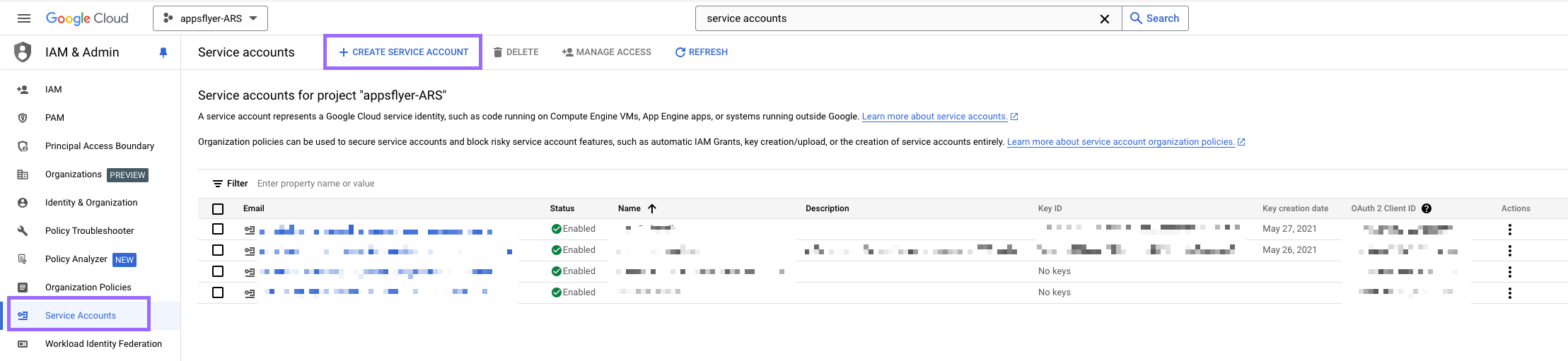 - In the Google Cloud Platform, go to the Service accounts section and click Create Service Account.