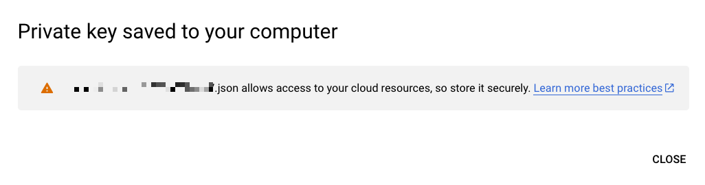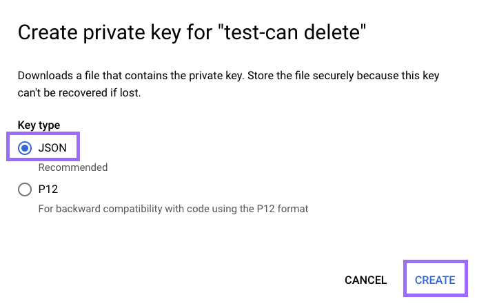 - In the Create private key popup, under Key type, select JSON, and click Create.