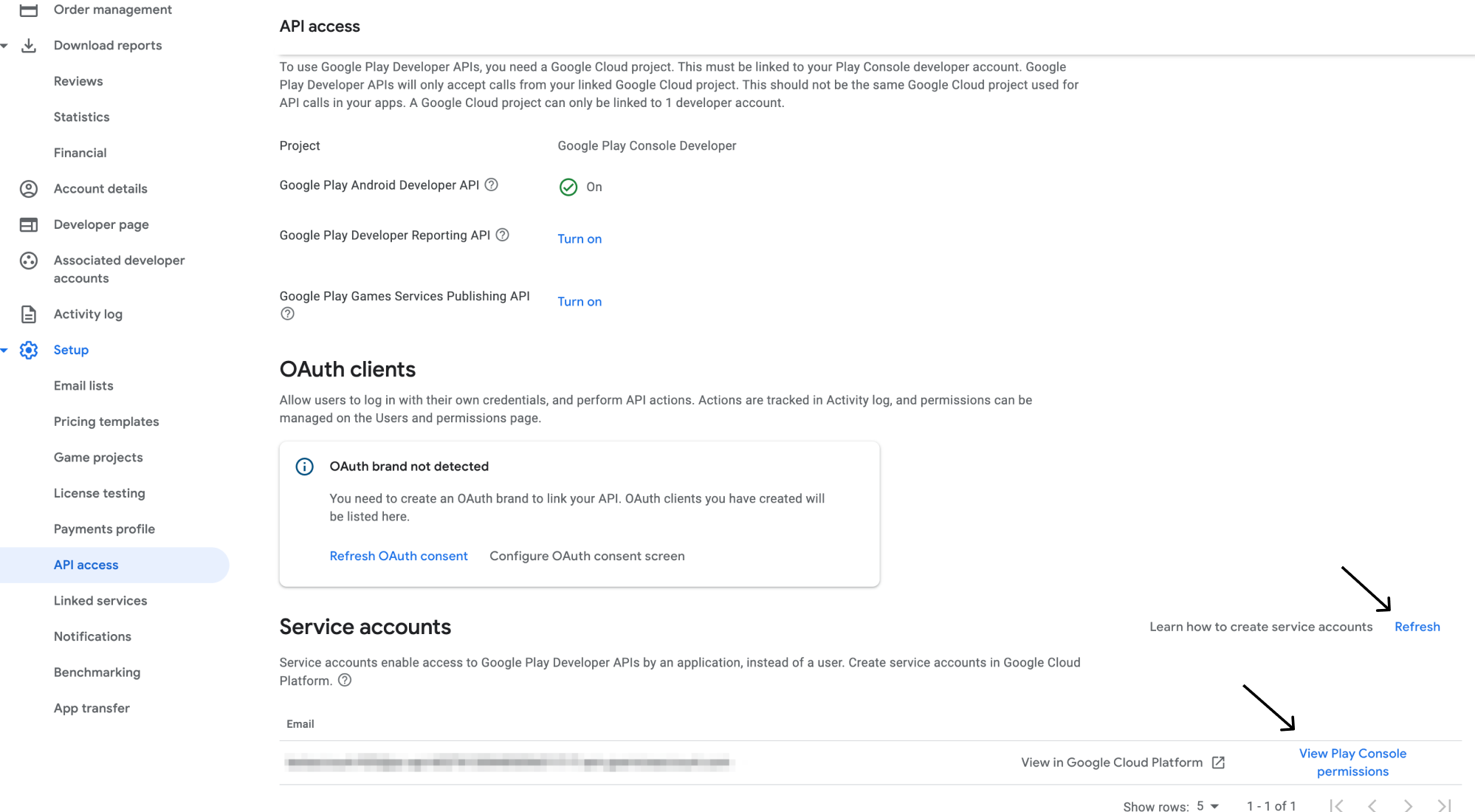Go to Google Play Console → Manage developer accounts → Choose developer account → Setup → API Access and choose your Google Play Console Developer project from step 2 where you have created your Service Account;