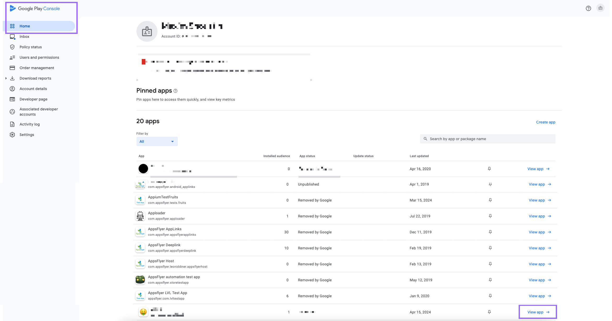 - In Google Play Console > Home, select to view your app. The dashboard opens.