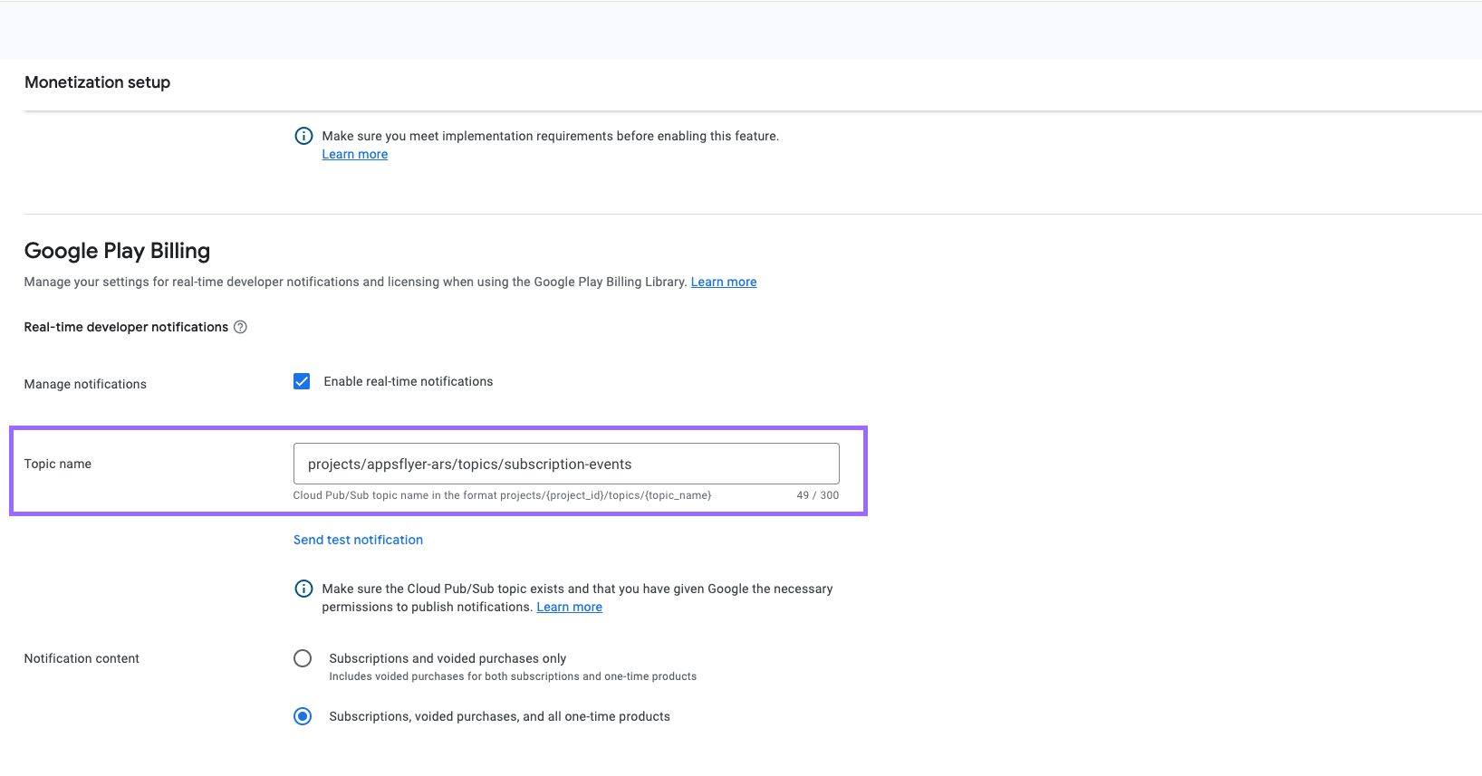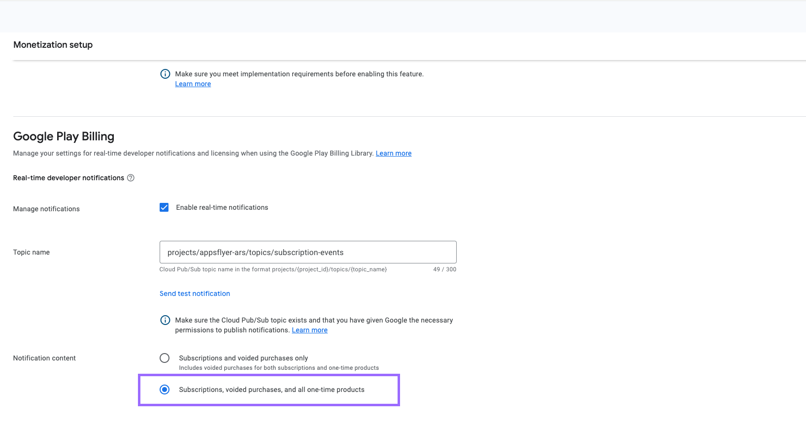 - Go to Monetize with Play > Monetization setup, and in the Google Play Billing section, make sure Enable real-time notification is checked.