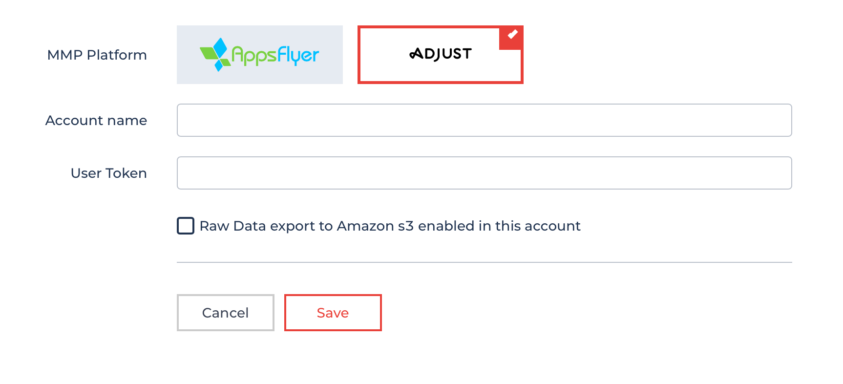 For Primary MMP Account choose your Adjust account, you can leave Secondary MMP Account empty, for Raw Data Source choose Amazon S3 Bucket (if you have one and if you have added it with your Adjust account) or choose Global Callback(enabled by default).