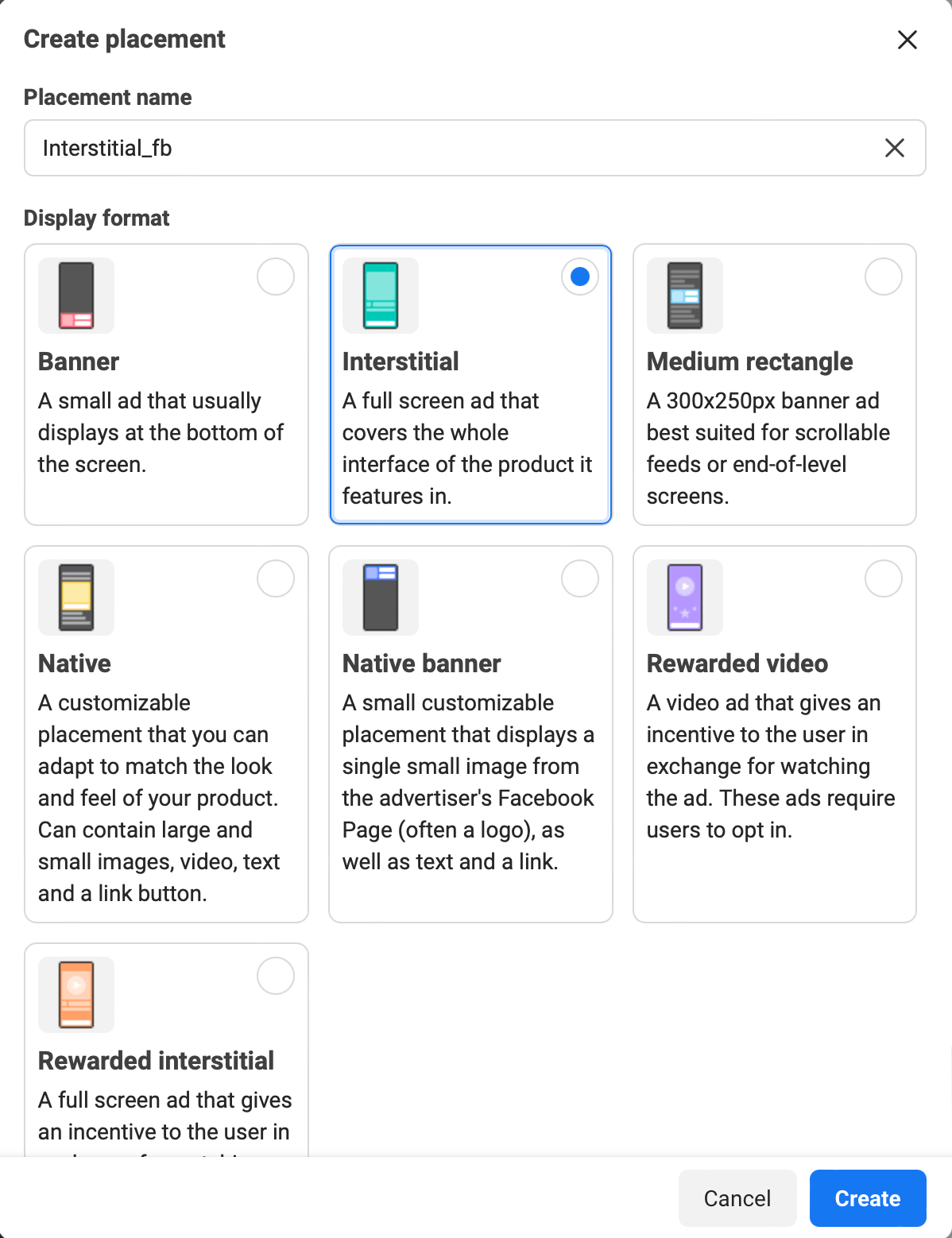 b. Create Placement. You need to select the desired ad format. The most effective ad formats for Meta are Interstitial and Rewarded video (this one is for game apps only).