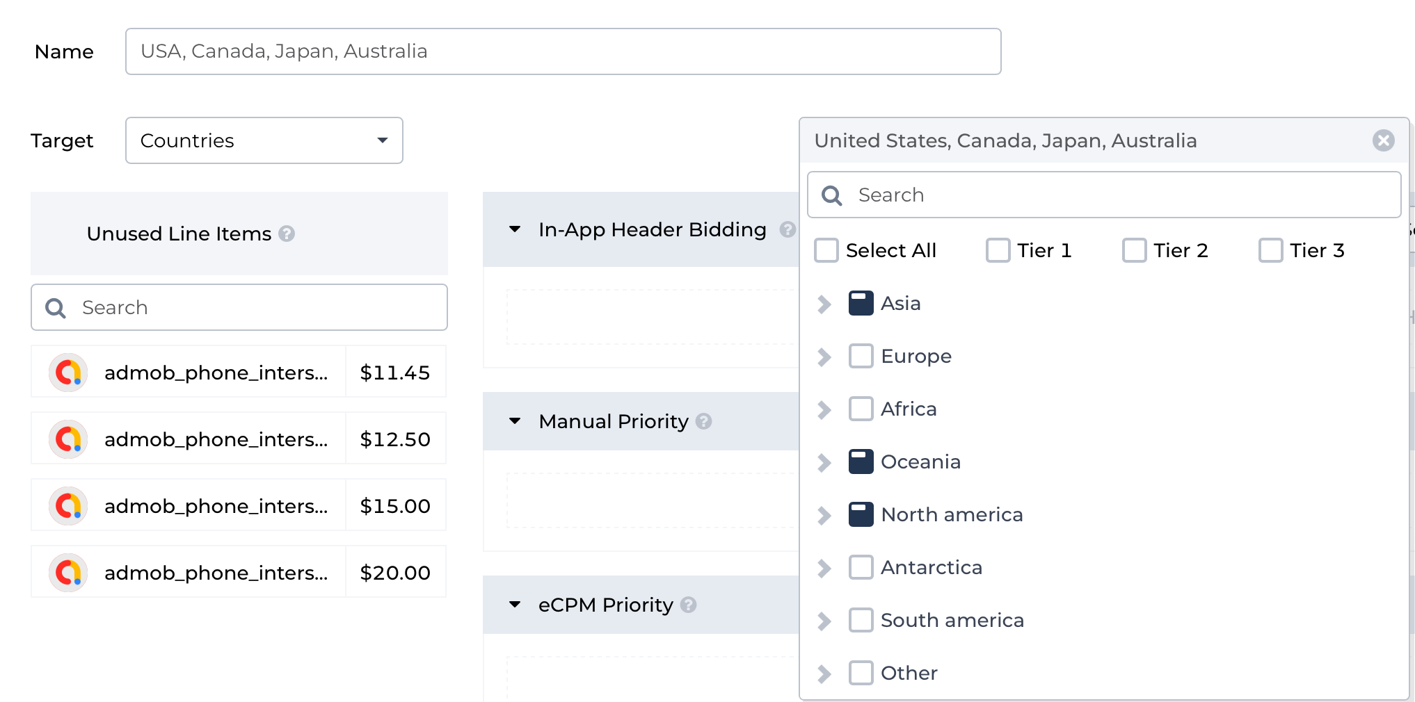 Priorities give you the power to create custom waterfalls. With this functionality, you can manage Ad Units order using one of four modes: in-app header bidding, manual, eCPM, and automatic, or you can use all of them at the same time. Moreover, you can create waterfalls for each of the countries, or you can even target the waterfall for certain user segments.