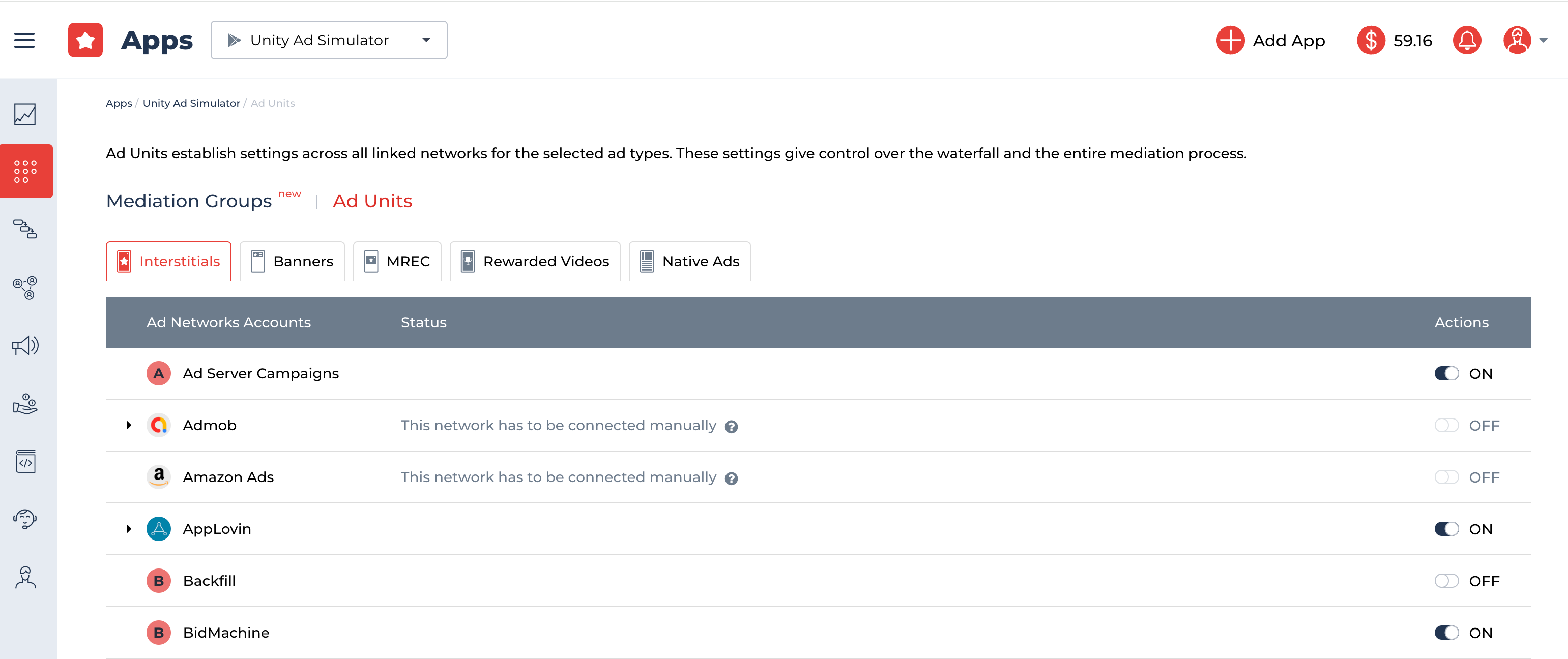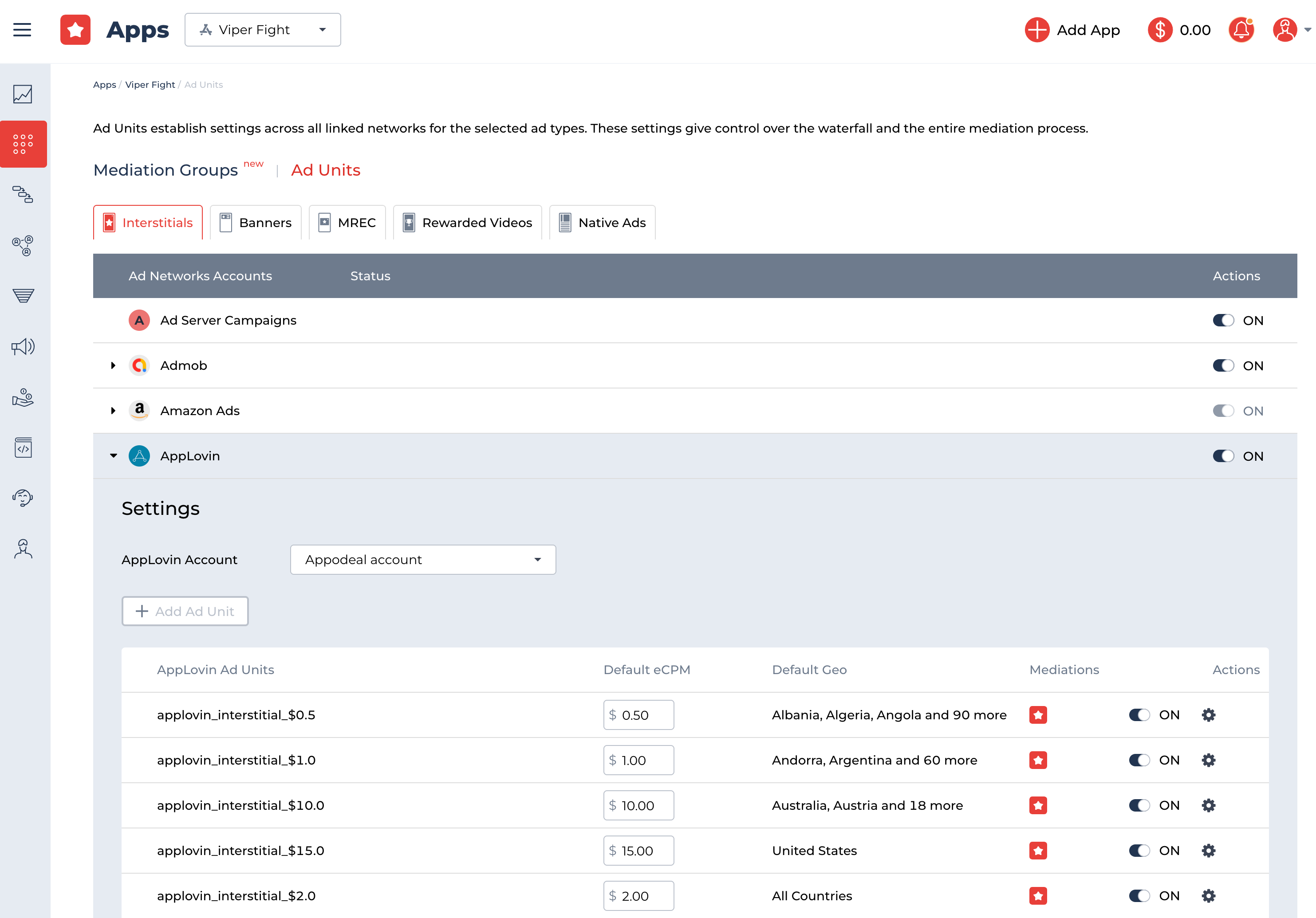Select the Mediation Settings tab. For your convenience, we divided Ad Units by the ad types.