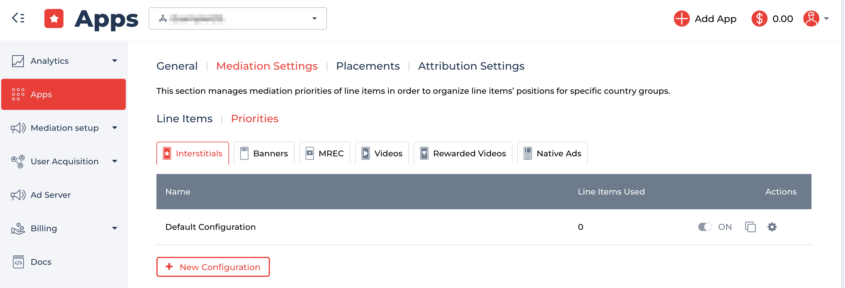 Priorities is a feature that allows you to move Ad Unit positions around with the “drag and drop” function and organize them into country/segment groupings that are easy to create. In other words, you can manage your waterfall configuration in a number of ways. Whenever you create a new app, we automatically add “Default configuration,” where all the Ad Units are located in the Automatic Priority section. By default, this configuration is applied to all countries/segments. If you add the Ad Unit to the custom priority, it will override the "countries" setting for this Ad Unit. Thus it can work for the country which isn't selected in the settings of this Ad Unit. You can create new configurations for the specific ad type by clicking the “New Configuration” button.