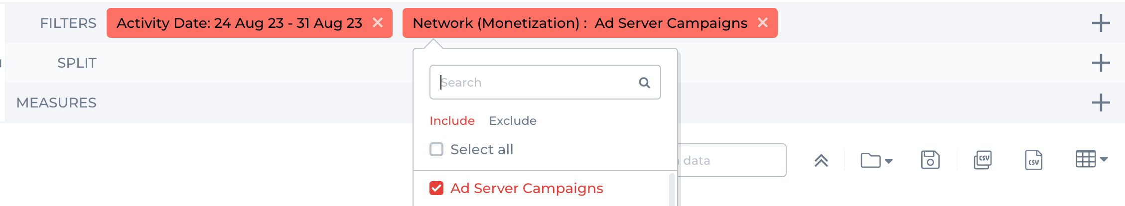 Всю статистику по вашим кампаниям можно посмотреть на странице отчетов выбрав "Ad Server Campaigns" добавив в Filters параметр Network(Monetization):