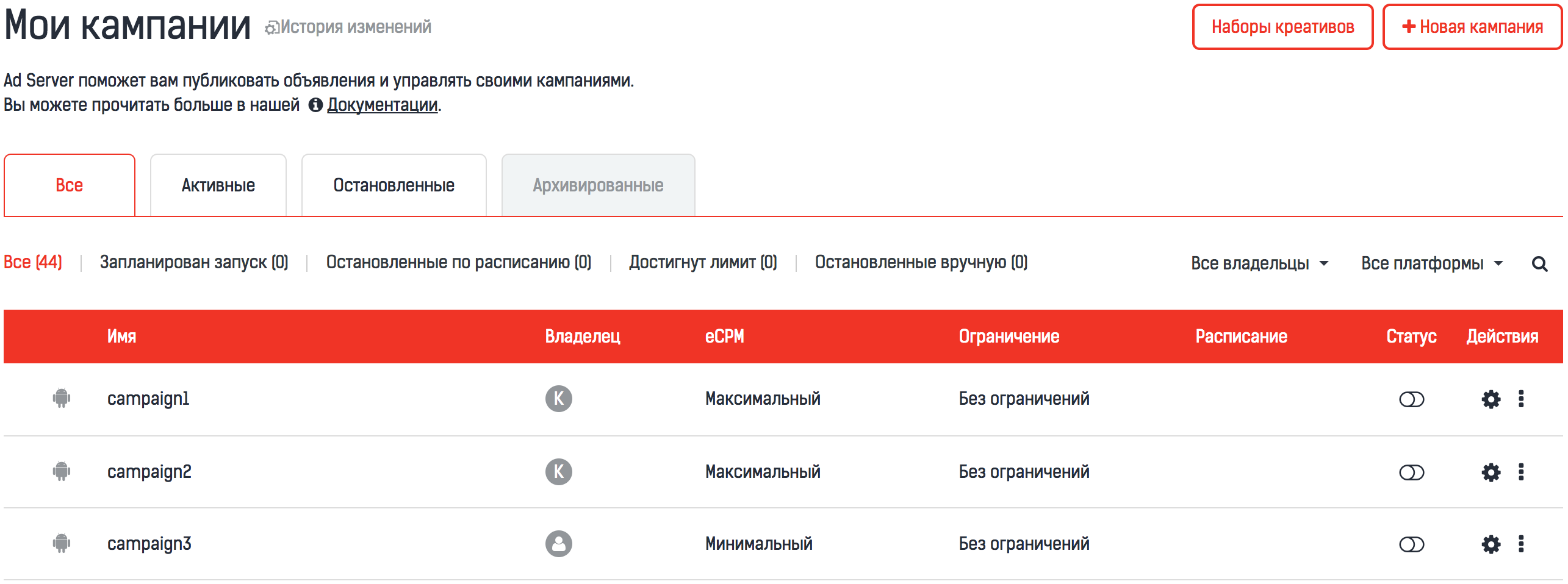 Чтобы создавать рекламные сеты, а т акже просматривать и управлять ими, нужно нажать на кнопку "Рекламные сеты". Другие элементы на этой странице связаны непосредственно с самими кампаниями. Колонки "Имя", "Владелец" и "eCPM" говорят сами за себя. С помощью кнопки-переключателя в колонке “Статус” можно включать/выключать кампании. Колонка "Ограничение" отображает имеющиеся ограничения по количеству показов у кампании. В колонке "Расписание" показываются даты запуска/остановки кампании, если таковые были заданы.