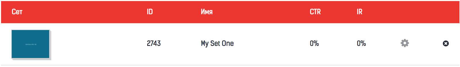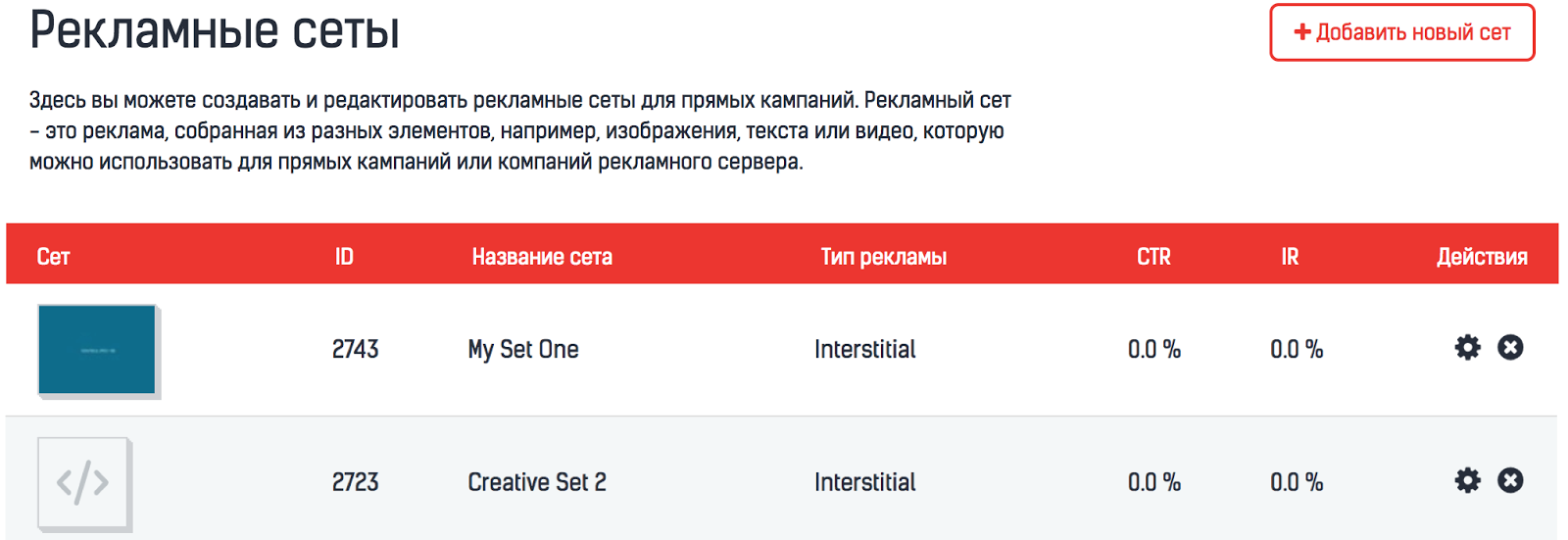 Чтобы отредактировать любой рекламный сет, вам нужно нажать на уменьшенную копию сета или на иконку шестеренки в колонке “Действия”. Также при желании вы можете удалить любой сет, нажав на иконку с белым крестом. Кроме того , нужно помнить о том, что невозможно удалить рекламный сет, который уже используется в одной или нескольких кампаниях.