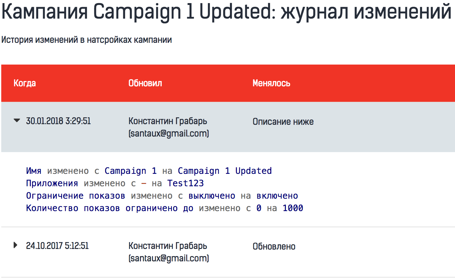 Иконка шестеренки в колонке “Действия” позволяет вам редактировать созданные кампании, а иконка белого крестика в круге позволяет полностью удалить кампанию. Также, вы можете посмотреть статистику кампании за неделю, нажав на пункт меню "Статистика" или скопировать кампанию нажатием на "Скопировать кампанию". Наконец, есть опция отображения истории изменений за весь период существования кампании:
