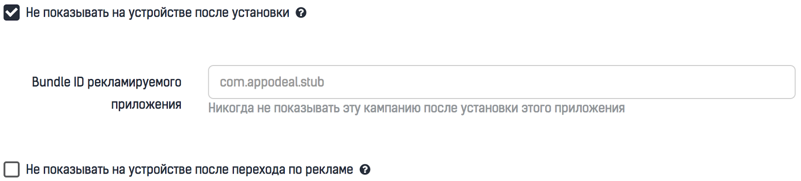 - не показывать на устройстве после установки / после перехода по рекламе;