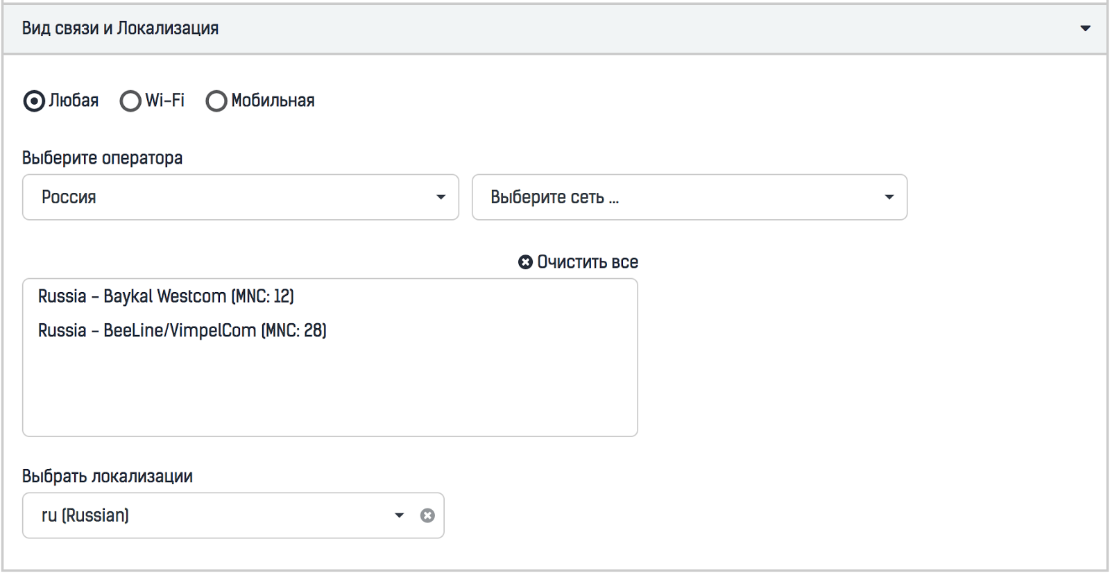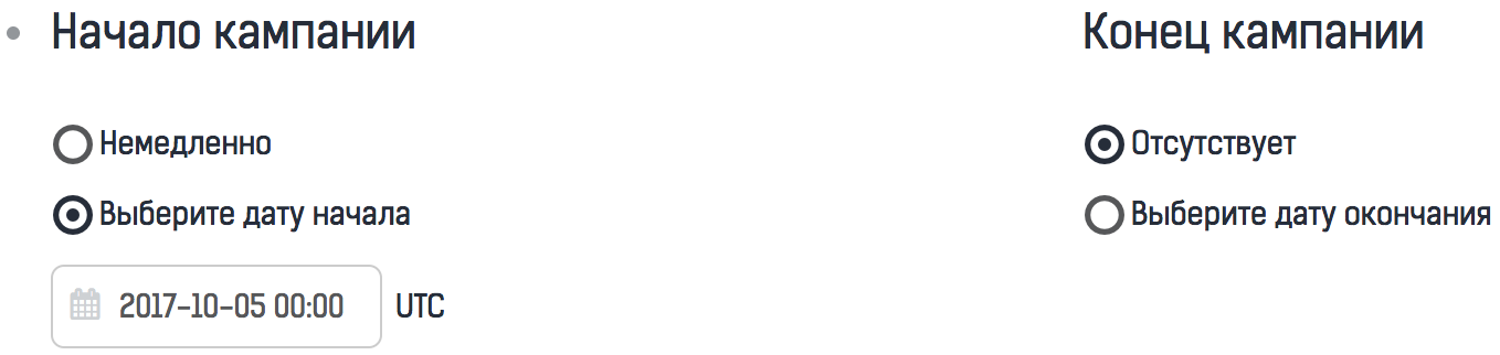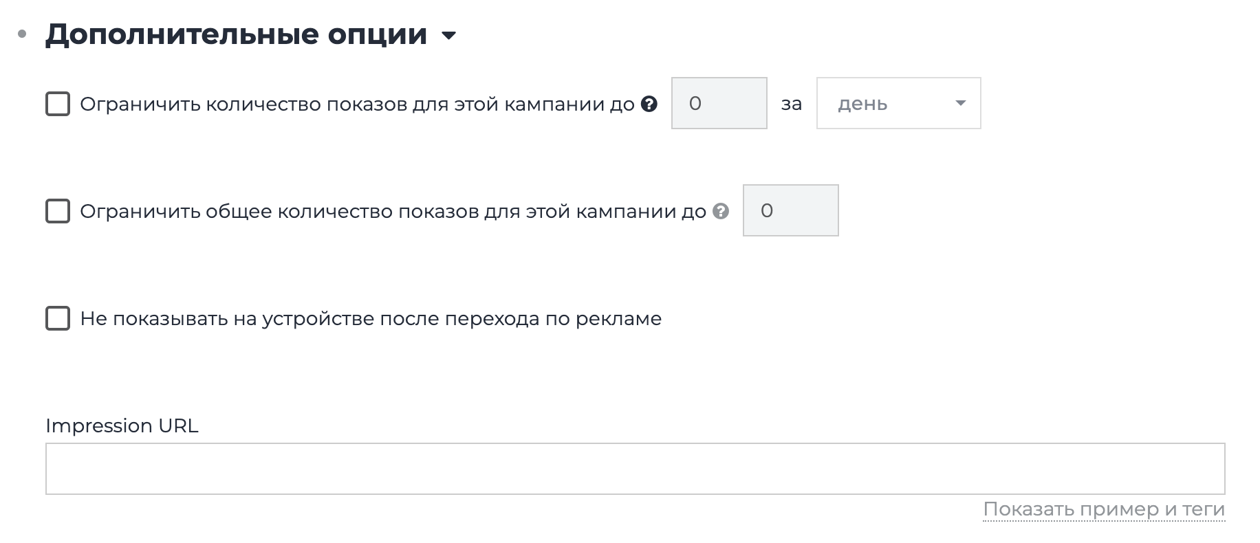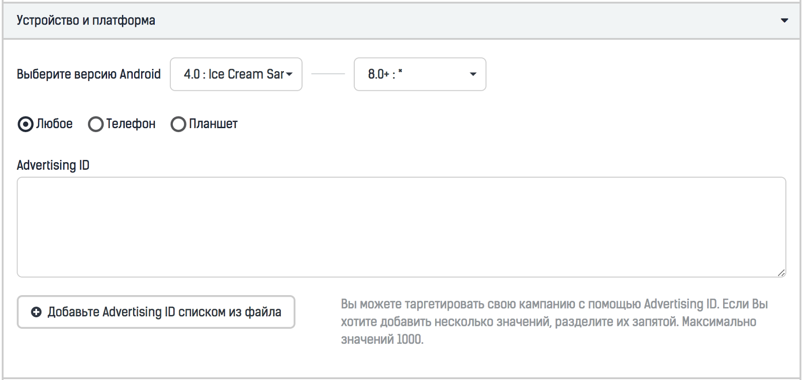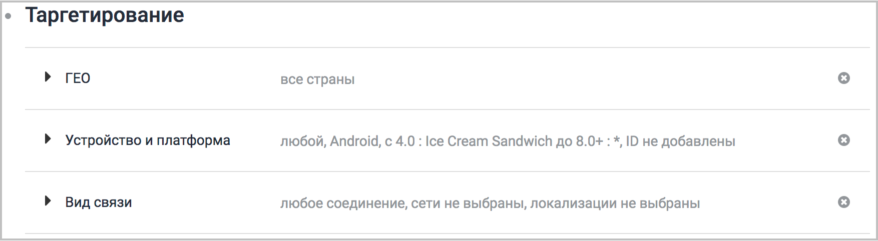 Вы можете выбрать множество опций для таргетирования или ограничений вашей кампании (эти опции представлены в следующих разделах).