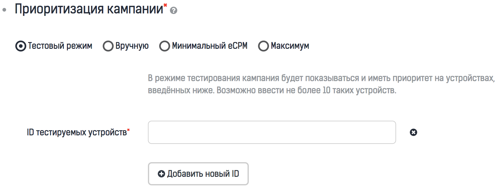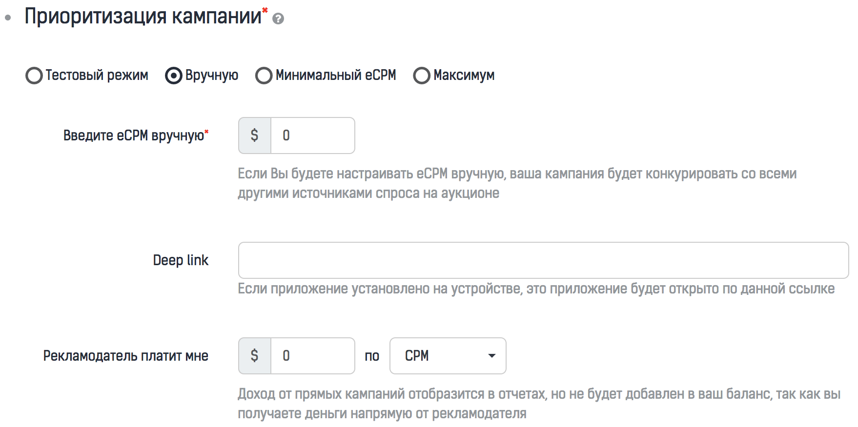 - Выберите приоритет для вашей кампании (Вручную, Минимальный eCPM, Максимум);