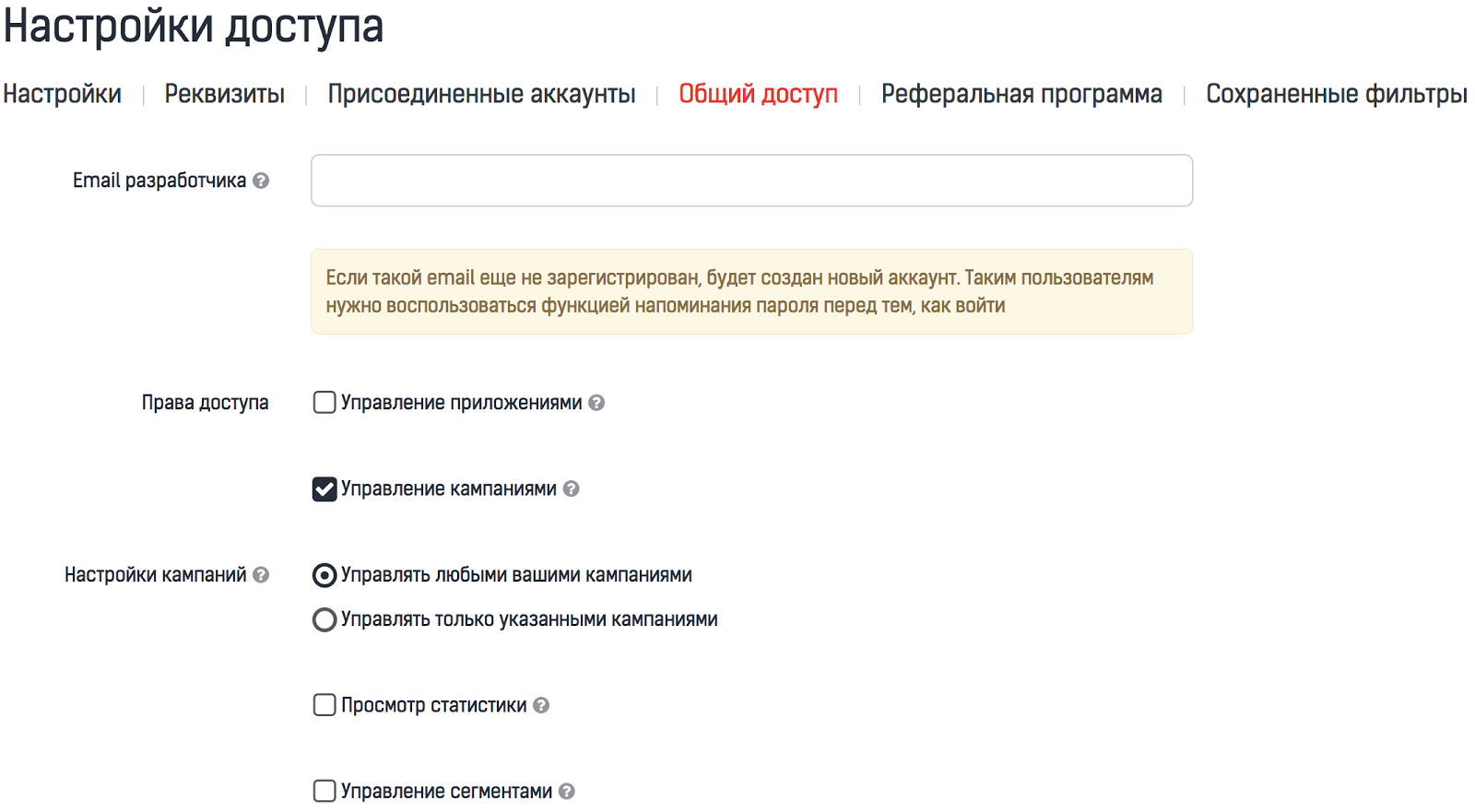 Вы можете предоставить другим пользователям право управлять кампаниями. Для этого следуйте следующим пунктам: