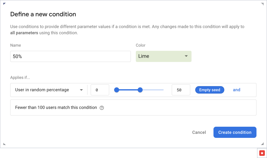 Для условия выберите User in random percentage и выберите от 0 до 50.