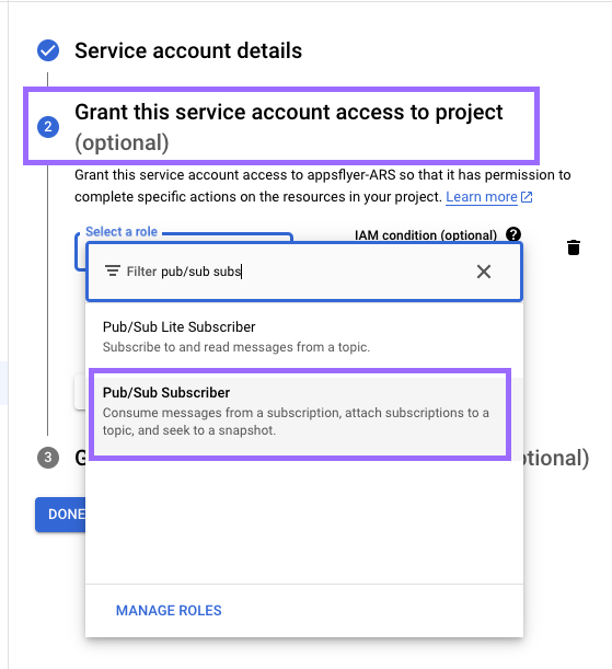 1. На шаге Grant this service account access to the project выберите роль подписчика Pub/sub, после чего нажмите кнопку Done.