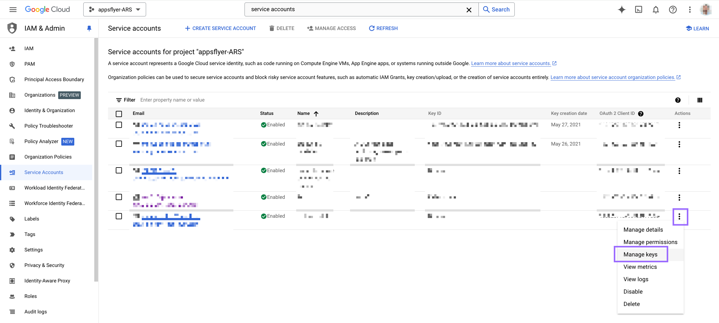 В Google Cloud Platform перейдите в раздел Service accounts, найдите нужный вам аккаунт (тот, который вы только что создали) в списке и нажмите на значок More actions.