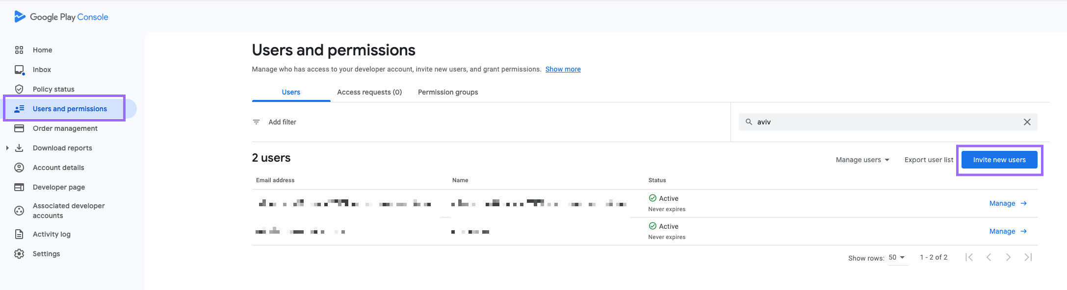 1. В Консоли Google Play перейдите в раздел Users and permissions, найдите созданный вами аккаунт службы и нажмите Invite new users.