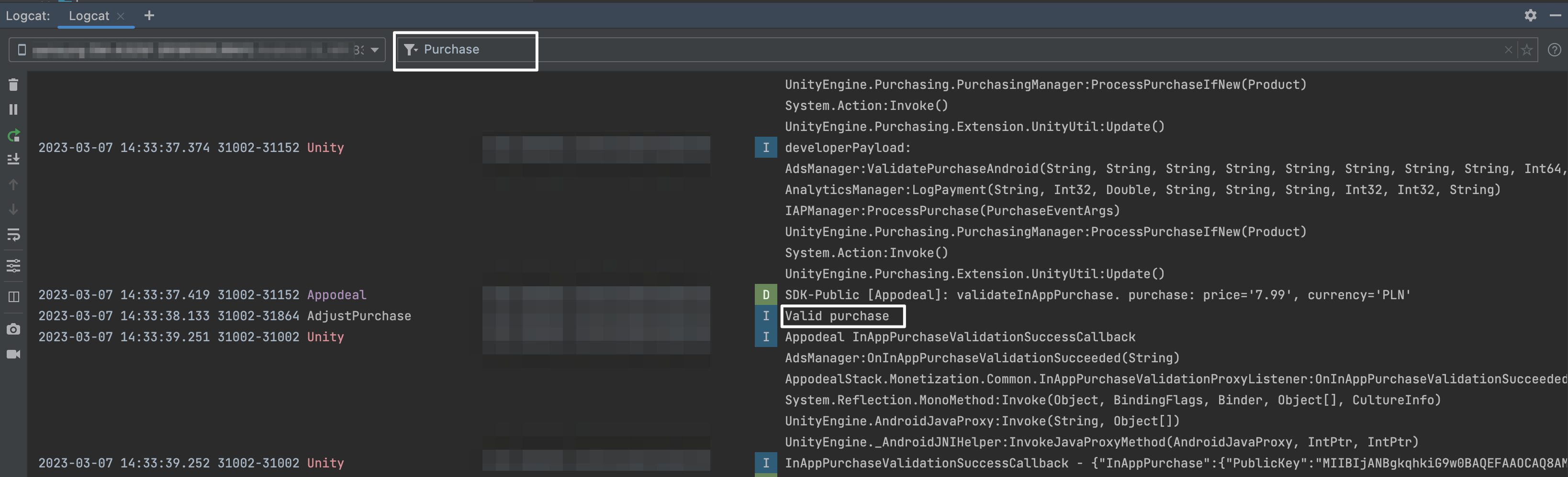 1. Подключите ваше устройство к компьютеру с открытой консолью (Android Studio logcat) и отсортируйте логи по слову purchase;