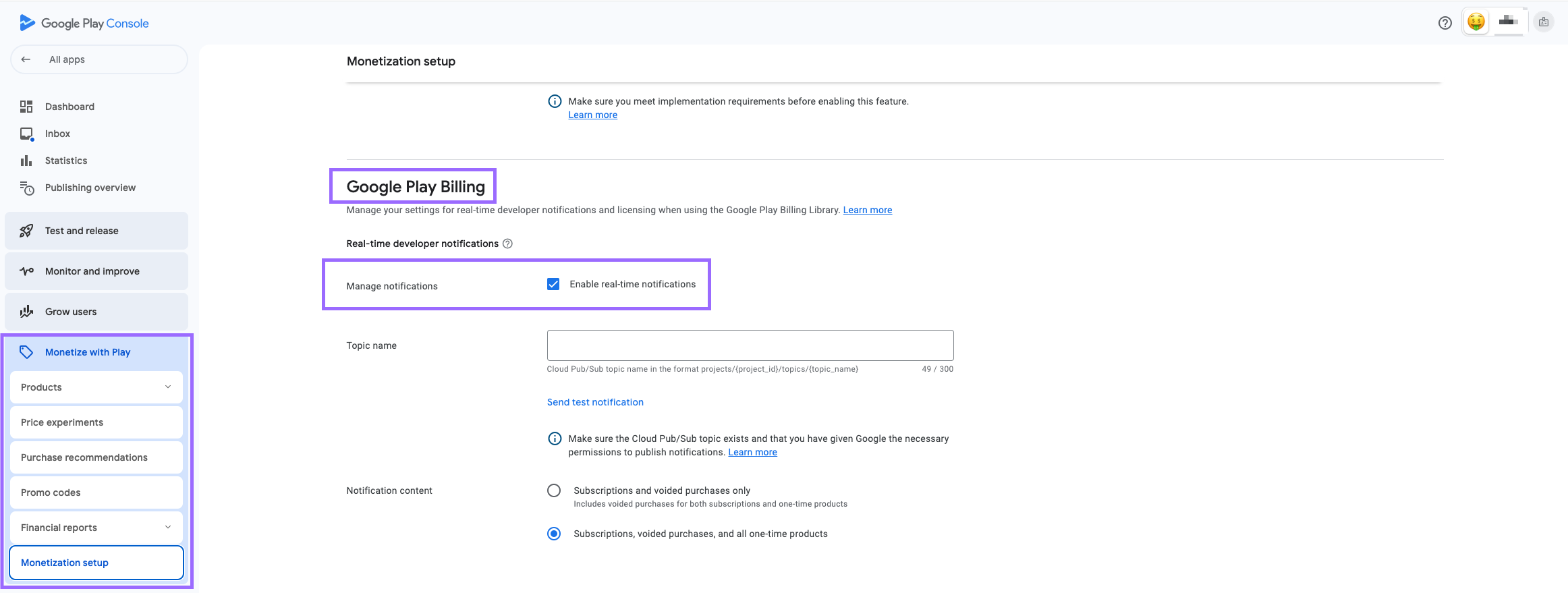 1. Перейдите в раздел Monetize with Play > Monetization setup и в разделе Google Play Billing section убедитесь, что Enable real-time notification.