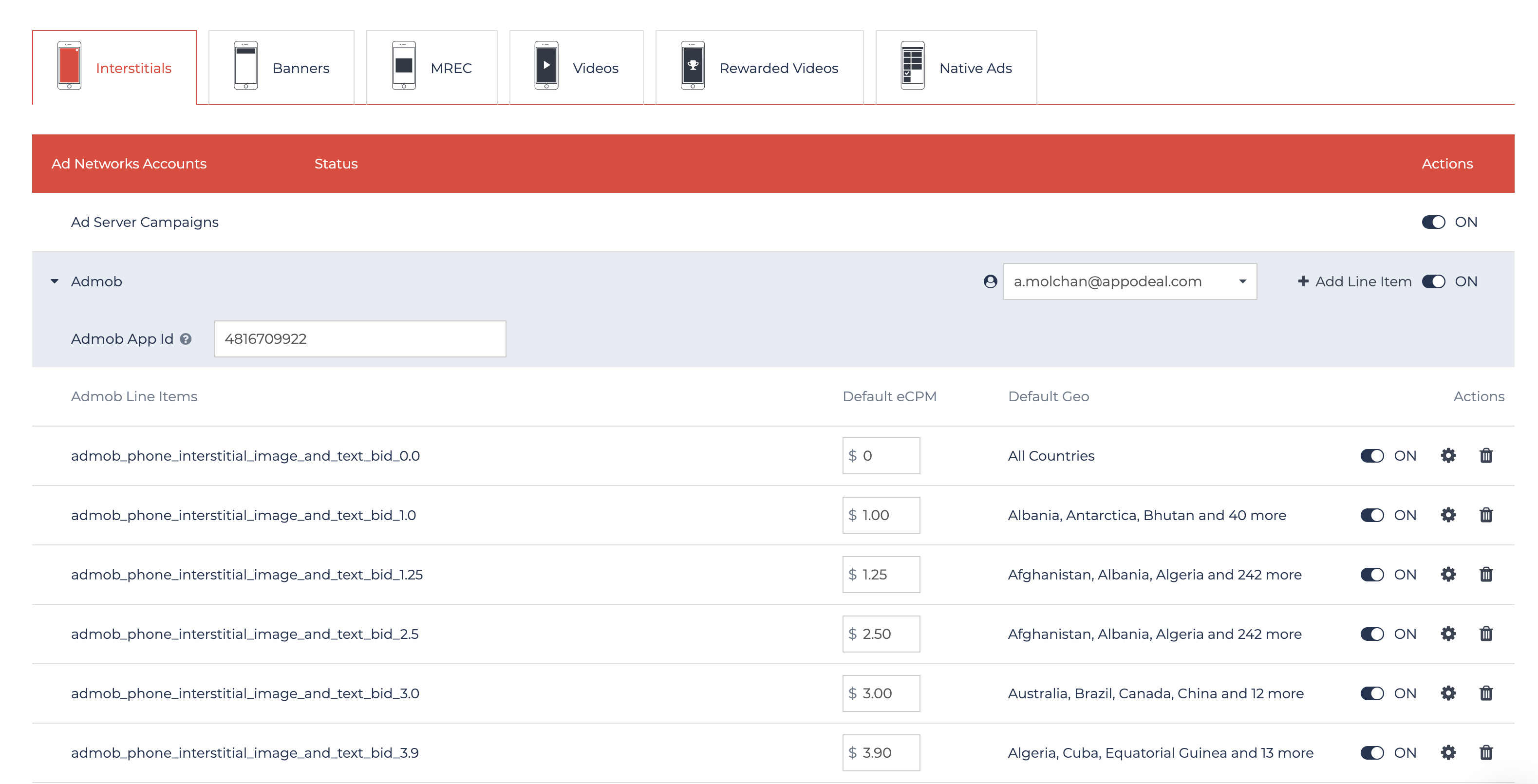 В секции Line Items вы можете увидеть правила, необходимые для автоматического подключения некоторых сетей. Как только вы выполните все требования, сети будут автоматически подключены с использованием дефолтной учетной записи Appodeal. Например: