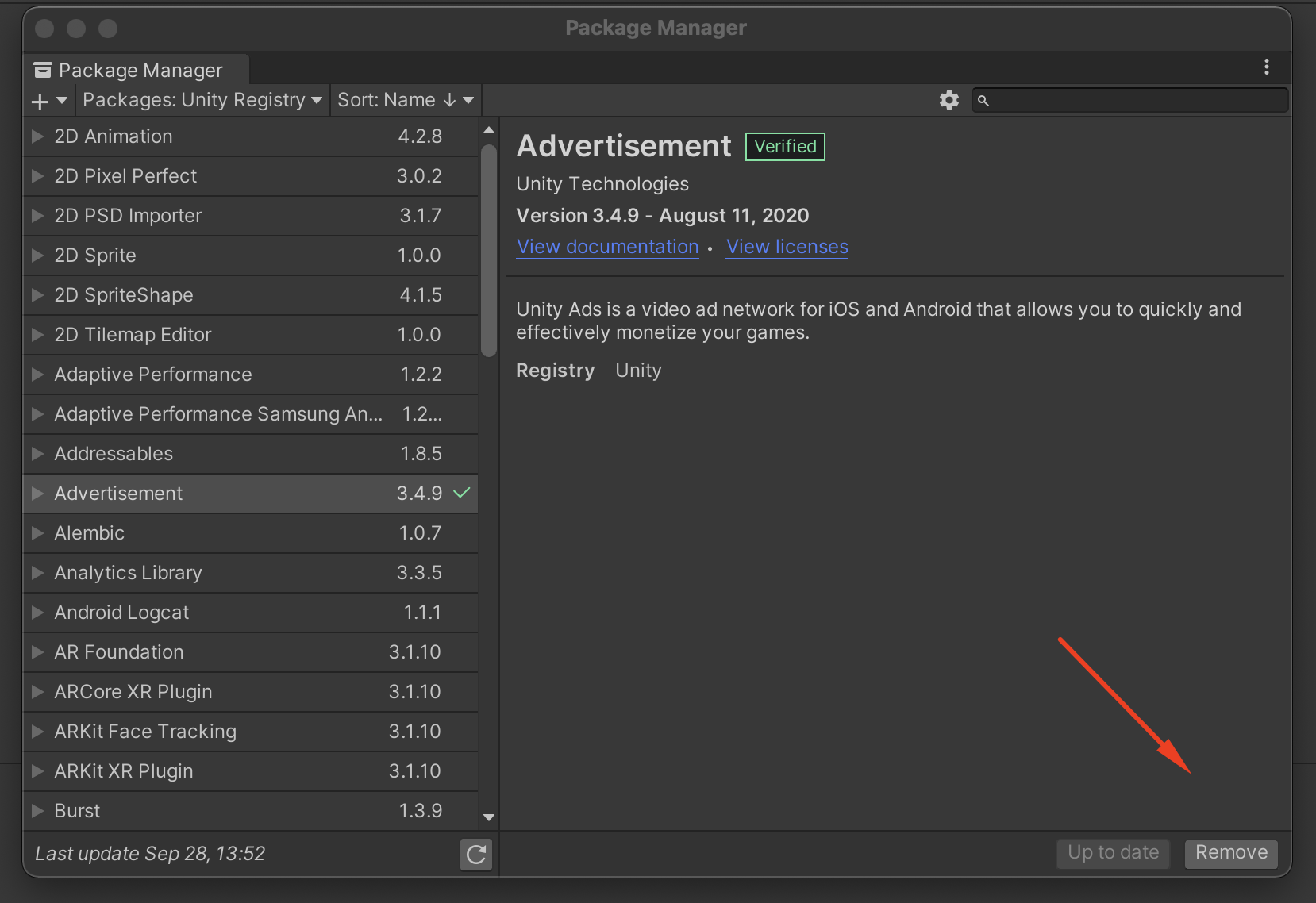 1. Перейдите в Window → Package Manager и удалите пакет Advertisement.