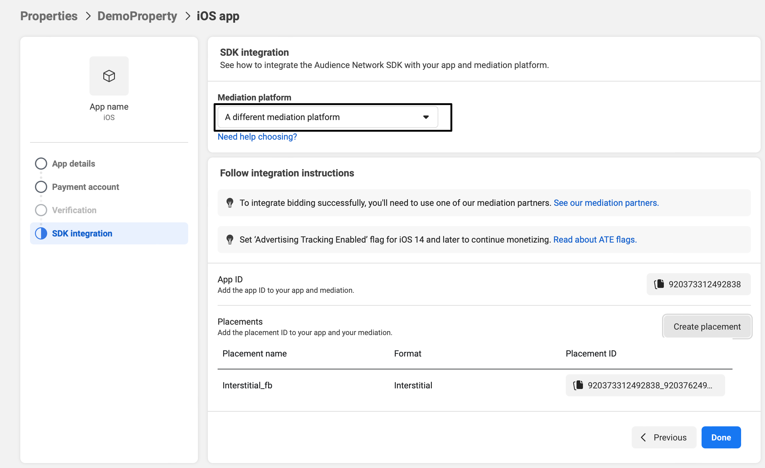 б. Создайте placement. Вам нужно выбрать желаемый формат рекламы. Самые эффективные форматы рекламы для Meta - полноэкранная реклама(Interstitial) и видео за вознаграждение(Rewarded Video) (только для игровых приложений).