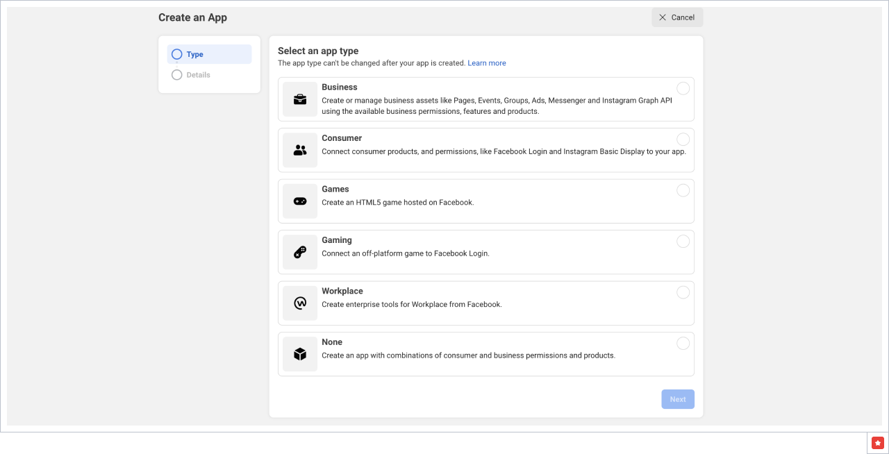 1. Выберите тип приложения в зависимости от ваших потребностей. Узнайте больше о типах приложений здесь.