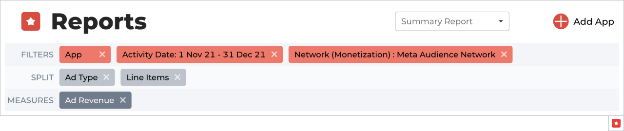 2. Создайте отчет с фильтрами App, Ad Network (выберите Meta Audience Network), разделите по Line Items и Ad Type. Добавьте показатель Ad Revenue.