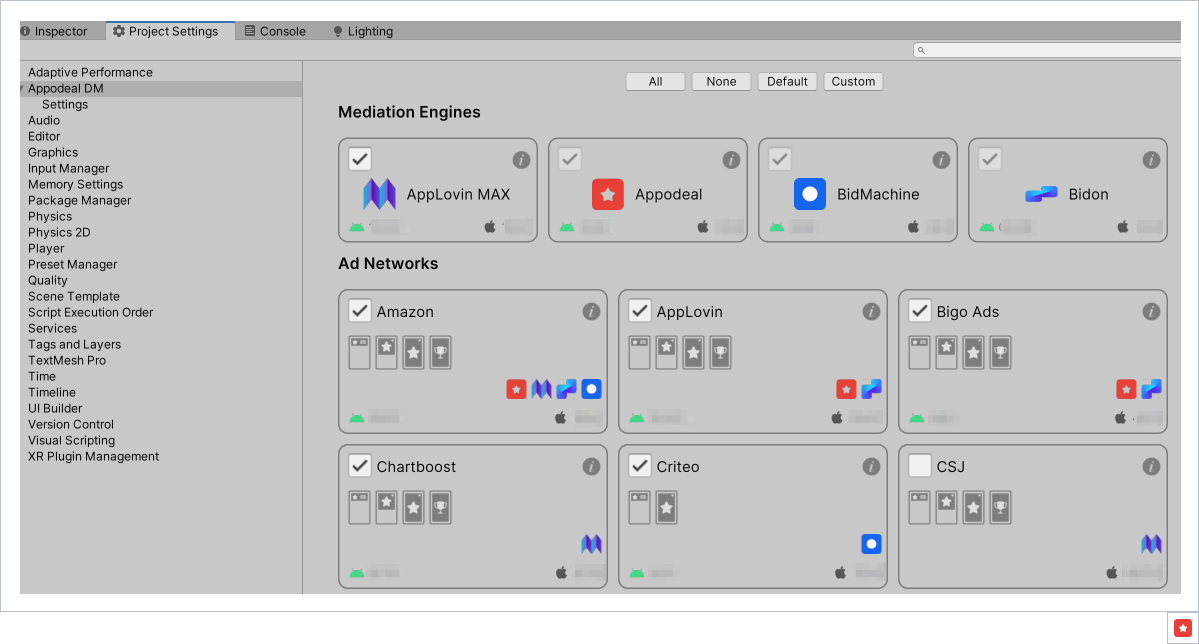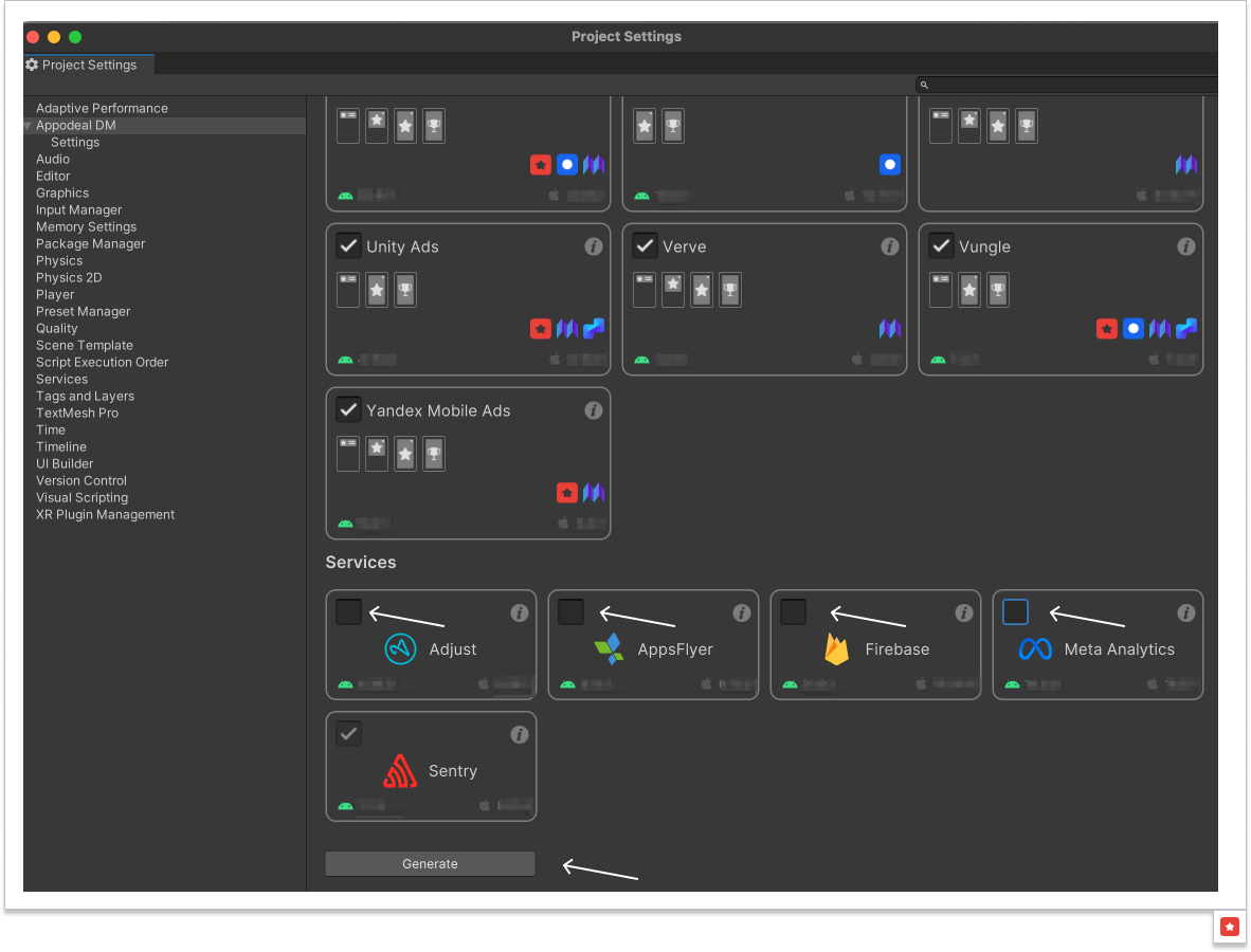 После добавления пакета Appodeal все рекламные сети и сервисы добавляются по умолчанию. Вы можете использовать Appodeal DM для удаления или импорта зависимостей.