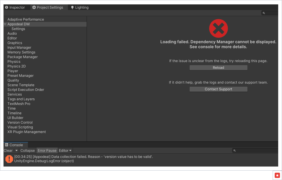 Если в данный момент невозможно отобразить Appodeal DM, вы получите ошибку, показанную ниже.