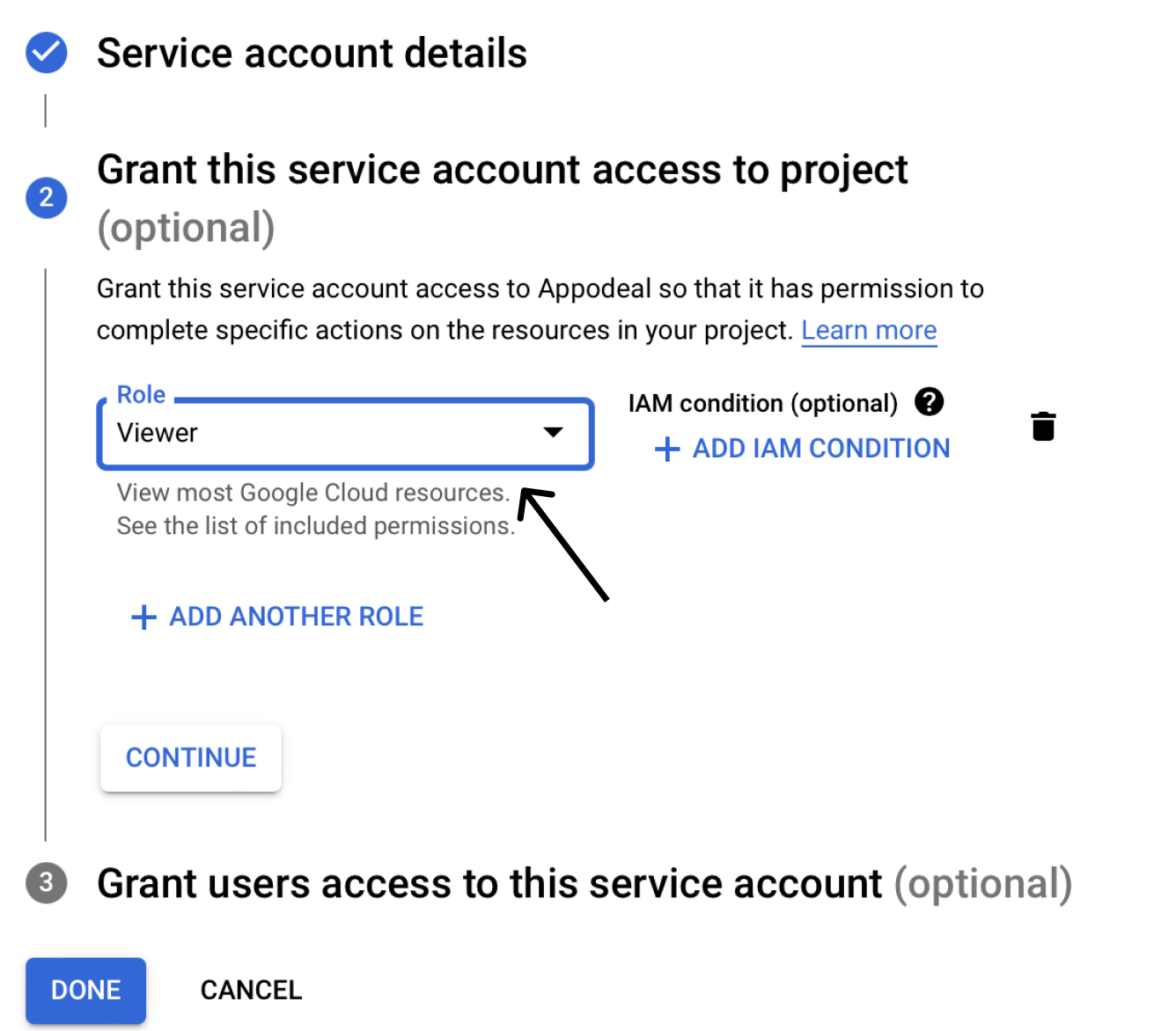 1. Выберите Viewer в качестве роли для Service Account и нажмите Done.