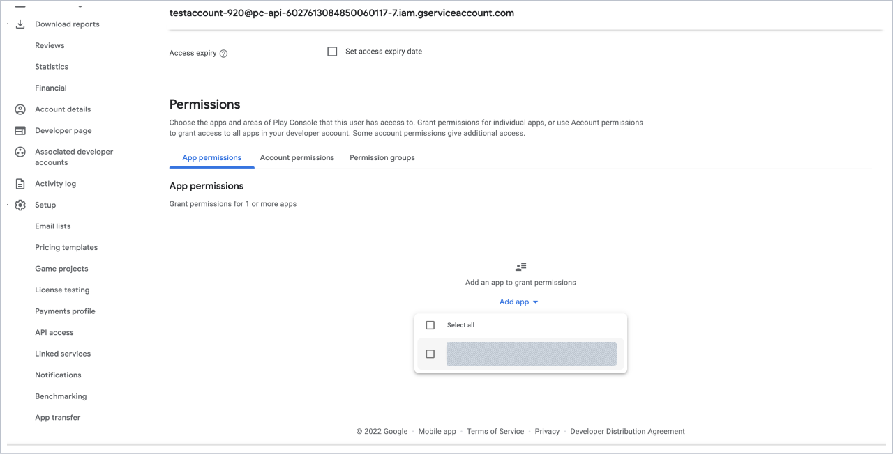2. Перейдите в Google Play Console → Manage developer accounts → Choose developer account → Setup → API Access и выберите свой проект Google Play Console Developer из шага 2, где вы создали свой Service Account.