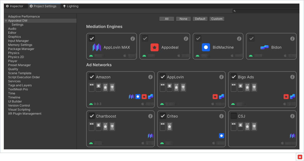 This section displays the available mediations inside Appodeal SDK. The versions for each platform are displayed at the bottom of each mediation.