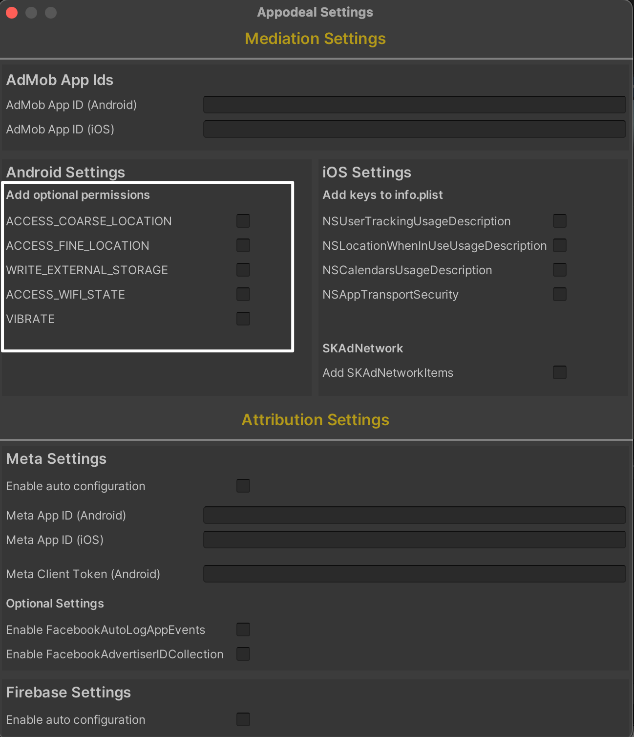 We distinguish 2 sets of permissions: required permissions, that are obligatory for the correct work of Appodeal SDK, and optional permissions, that can be used for better targeting. For more information about the purpose of each of the permissions, see this FAQ section.